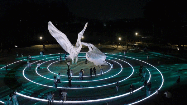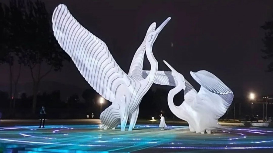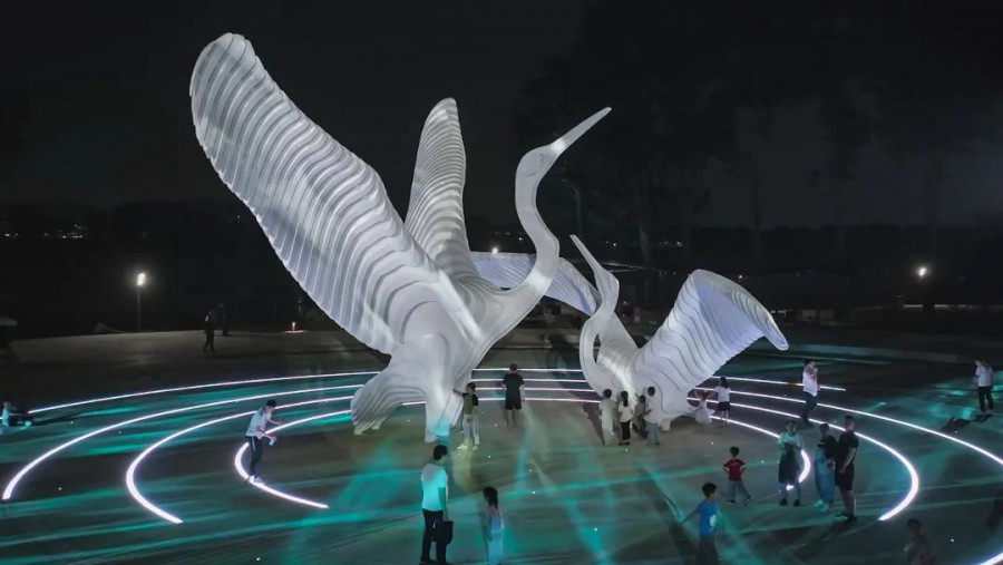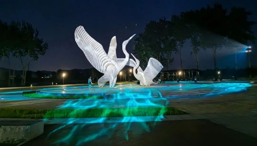 當燈光亮起,如同春風吹起內夾河河面漣漪,與展翅嬉戲的白鷺雕像呈現(xiàn)一動一靜的美好畫面,賦予雕塑動態(tài)光影的魅力。